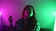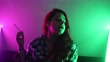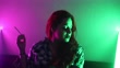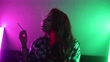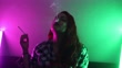 Pretty young woman smoking cigarette in bed. Illuminated with pink and green light.