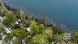 WS aerial track with Sea Otter swimming and carrying its pup along forested coastline - 4K stock video