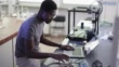 Young African-American technician sitting in the chair, thinking and repairing his 3D printer in the laboratory.