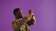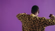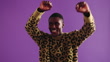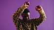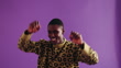 A handheld, close-up shot of a studio video portrait of a young man wearing a leopard print jumper, dancing in front of a purple backdrop and smiling. He has his arms raised in the air and is spinning them round while he dances.