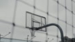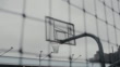 Handheld shot of basketball hoop seen from fence. Sports equipment against buildings. Court is against sky in New York city.
