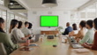 Business people, conference and green screen in online meeting, seminar and group planning or presentation. Professional women and men listening, watch or video call on TV or computer tracking marker - 4K stock video