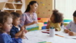 Cheerful teacher giving instructions to her diverse kindergarten class during art class - School concepts