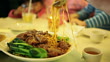 Woman serving beef and vegetable chow mein at a Chinese restaurant. Family out of focus eating in background.
