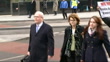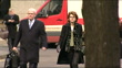 Chris Huhne speeding trial: Jury hears that wife sought revenge; ENGLAND: London: Southwark Crown Court:EXT*** WARNING SOME FLASH PHOTOGRAPHY ***Vicky Pryce (former wife of Chris Huhne) arriving at court (man in background with unrelated protest sign)ENDS