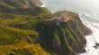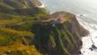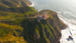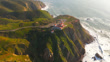 Aerial drone shot of lighthouse at Cabo da Roca in Portugal, westernmost point of Europe. Lighthouse stands on rugged cliff surrounded by green hills and winding roads. Waves crash against rocky shore as golden sunlight casts warm glow over landscape. Distant coastline stretches along Atlantic Ocean under clear sky.