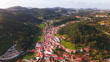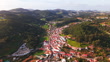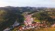 Aerial drone shot of townscape surrounded by lush greenery in Portugal on sunny day. Houses and buildings are scattered across the landscape, with fields and trees surrounding the town. The sunlight brightens the scene, highlighting the vibrant greenery and peaceful surroundings.