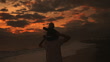 In this evocative footage, a father carries his child on his shoulders as they walk along the beach during a magnificent sunset. The silhouettes of the pair are beautifully framed against the fiery orange and red hues of the sky, reflecting off the gentle waves of the ocean. This tender moment captures the essence of familial love and the serene beauty of nature, perfect for projects highlighting family bonds, outdoor adventures, and the tranquil joys of parenthood at the beach.