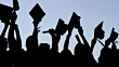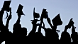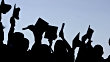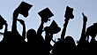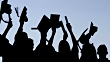 Silhouette of small group of graduating university students celebrating holding their graduation caps and diplomas in the air in front of a blue sky outdoors.