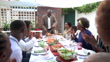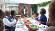 Multi generation family having Christmas lunch together at large outdoor table in backyard.