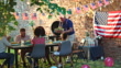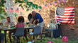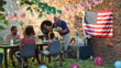 Happy multi ethnic family waiting for burgers at table for outdoor 4th July party - 4K stock video
