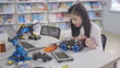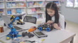 High view of Asian grl play and fun with robotic car alone in elementary class at school and sit with robotic arm on table - 4K stock video