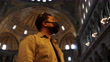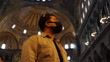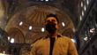 Inside the Hagia Sophia mosque, tourist man looking around, traveler man exploring, exploring Hagia Sophia, the ceiling of the Hagia Sophia, the interior of the mosque, man wearing protective mask - 4K stock video