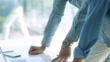 Male and female business people using a laptop computer in the office. They are casually dressed. There is a window behind them