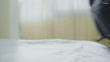 Medium handheld shot of male hands packing clothes into a backpack on the hotel bed and taking the passport off the bed before leaving. Shot in Slovenia.
