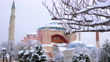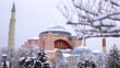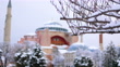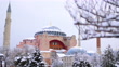 Outside view of the snowy Hagia Sophia Mosque, snowy view of Hagia Sophia, Hagia Sophia and Blue Mosque, snowy Hagia Sophia Square, inside the city, the mosque minaret, 4K Snowy Istanbul Shots in Winter - 4K stock video