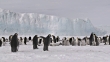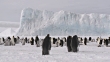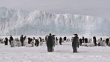 Wide shot of an emperor penguin, walking slowly from left to right, in front of the penguin colony. The camera follows the walking penguin in a slow pan from left to right. In the background, there's an impressive piece of antarctic landscape- a huge block of light blue ice /snow beneath a cloudy grey sky. The penguin colony in the back consists of adult and young birds, sleeping, watching, flapping their wings or cleaning their plumage.