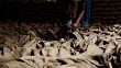 Unrecognizable person sewing wheat crop sacks in the grain market.