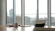 Telephone, coffee cup and notepad on desk in empty office overlooking city. MS, slow motion.