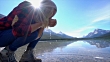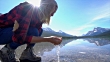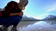 Blond girl drinking fresh water from mountain lake in Banff national park, Alberta, Canada. People travel nature environment concept